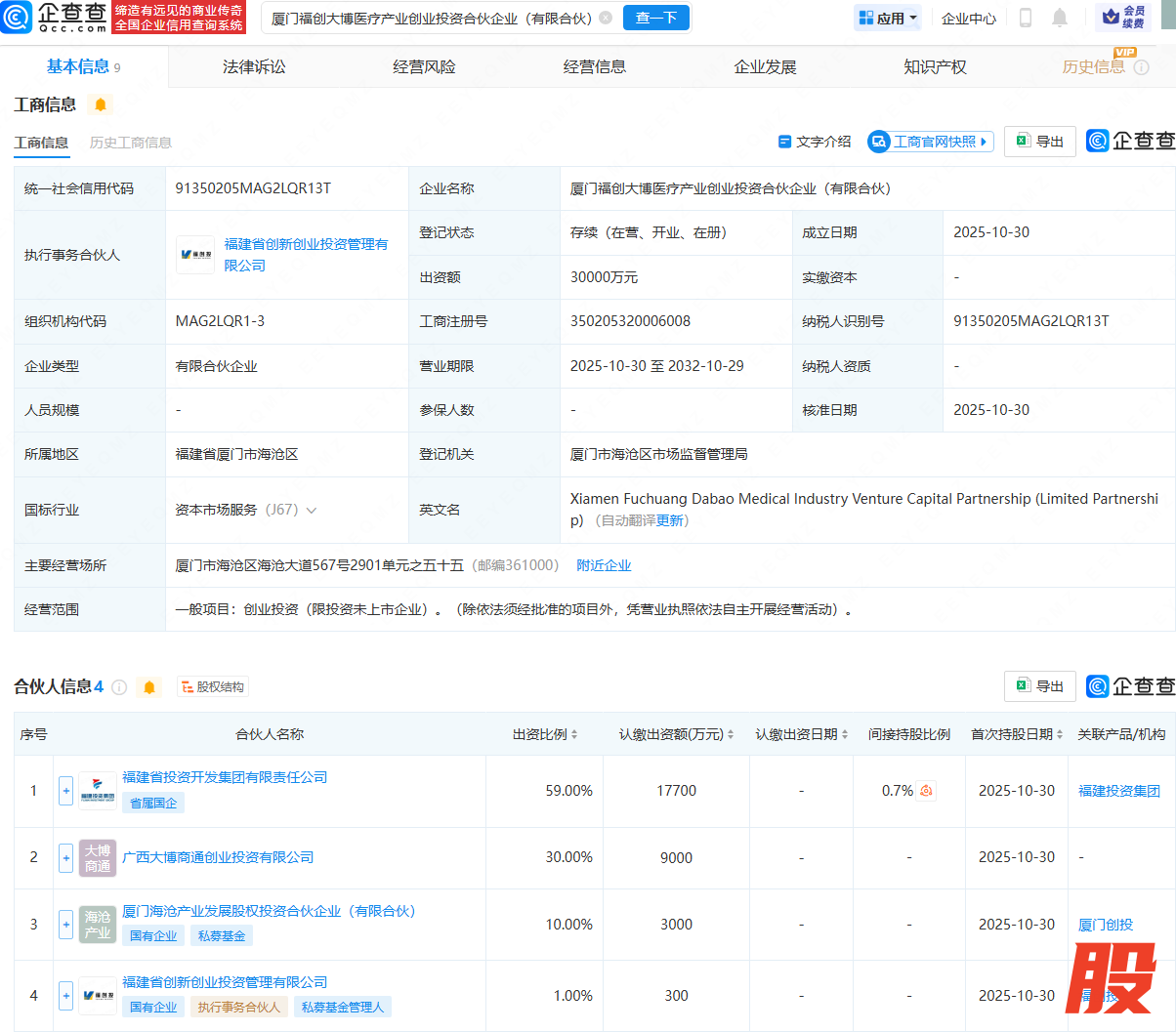 近日,厦门福创大博医疗产业创业投资合伙企业(有限合伙)成立,出资额3亿元,经营范围为创业投资(限投资未上市企业)。企查查股权穿透显示,该合伙企业由福建省投资开发集团有限责任公司、广西大博商通创业投资有限公司等共同出资。